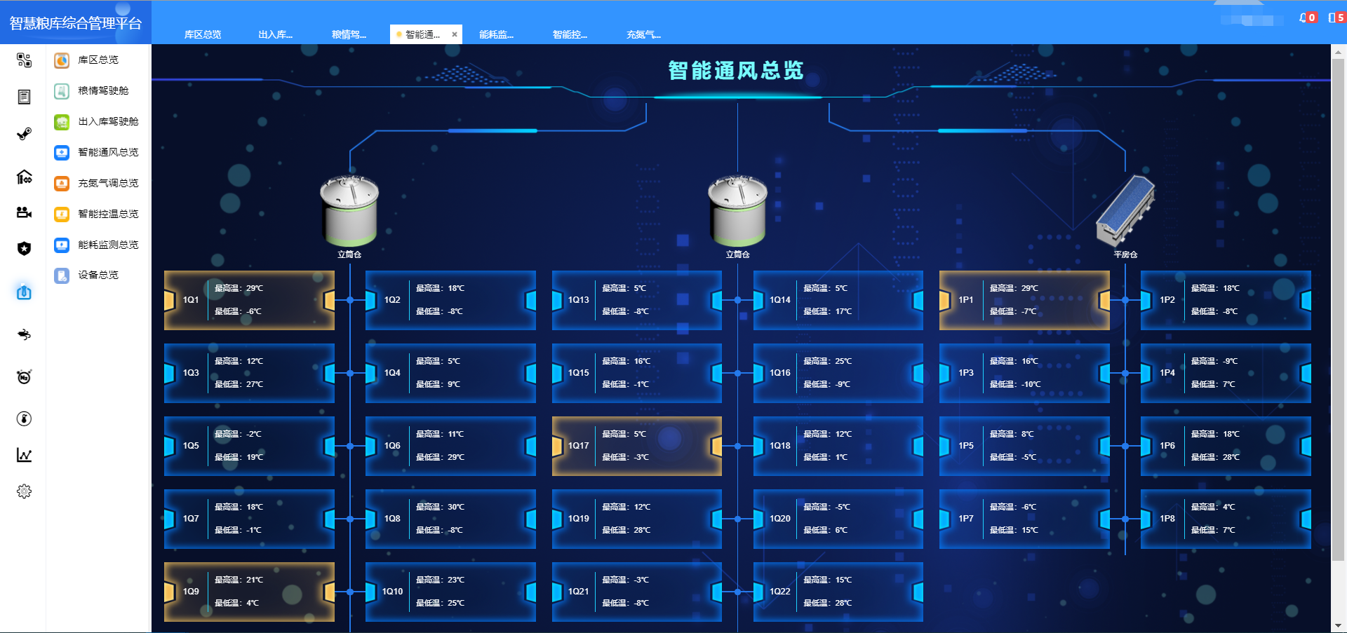 多功能糧情測控系統: 本模塊包含糧情總覽,糧情展示,糧情記錄,查糧管理,溫濕度糧情,蟲(chóng)害糧情,氣體糧情。供用戶(hù)對糧情的管理和查看。